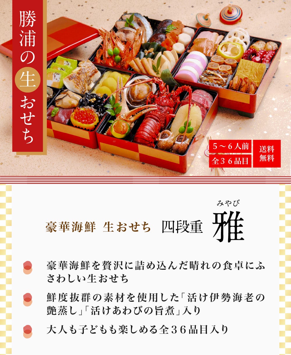 • 豪華海鮮生おせち「雅」四段重・5~6人前《生》本マグロ 大トロ・中トロ・赤身付き!(海鮮せいろ蒸し 勝浦)01