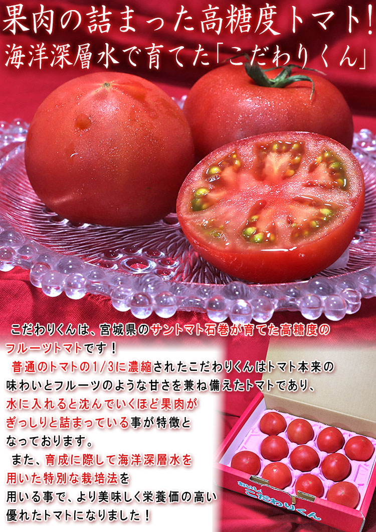 普通のトマトの1/3に濃縮されたこだわりくんはトマト本来の味わいとフルーツのような甘さを兼ね備えたトマトであり、水に入れると沈んでいくほど果肉がぎっしりと詰まっている事が特徴となっております。