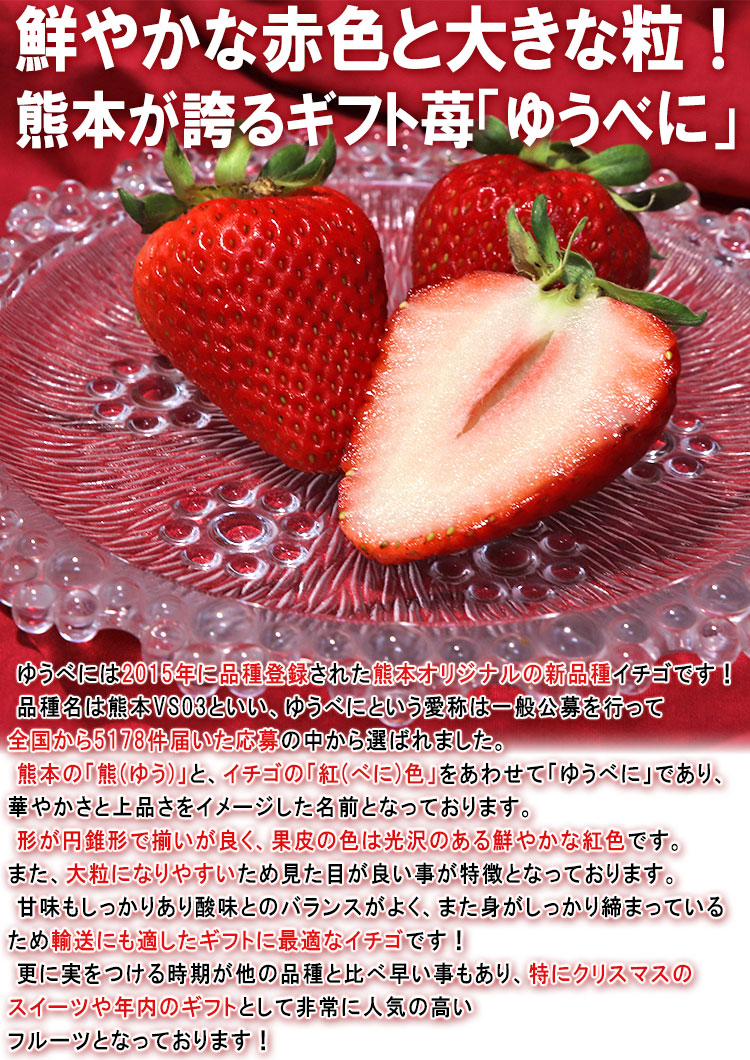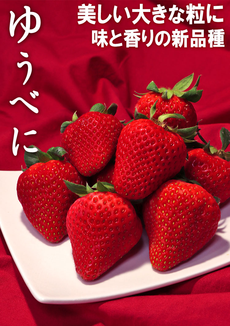 | 特徴 | 美しい赤色の大きい粒に、甘み豊かで程よい酸味の優れた味わいをもつ新品種の苺「ゆうべに」です!締まった果肉と美味しさから贈答として広く用いられる苺であり、農協の厳しい選果基準で厳選した高品質なフルーツとなっております。 |