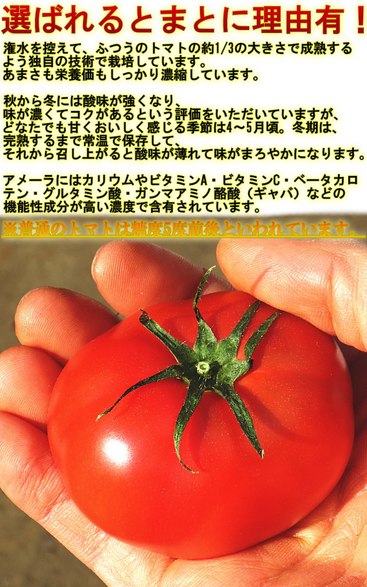 1年を通して糖度が7.2度以上の基準を満たす玉のみが出荷され、平均糖度9~10度の非常に糖度の高い品種となっております。特に4月~5月のアメーラは甘みと美味しさが増す旬の季節!(通常のトマトの糖度が5度前後)