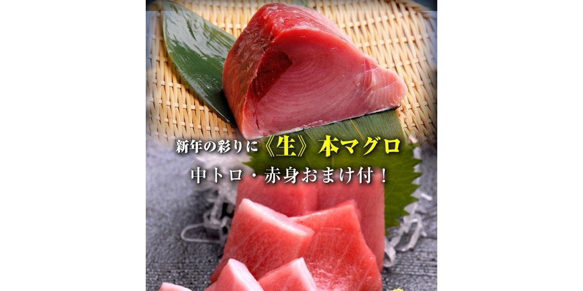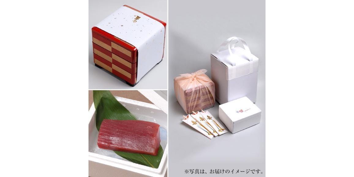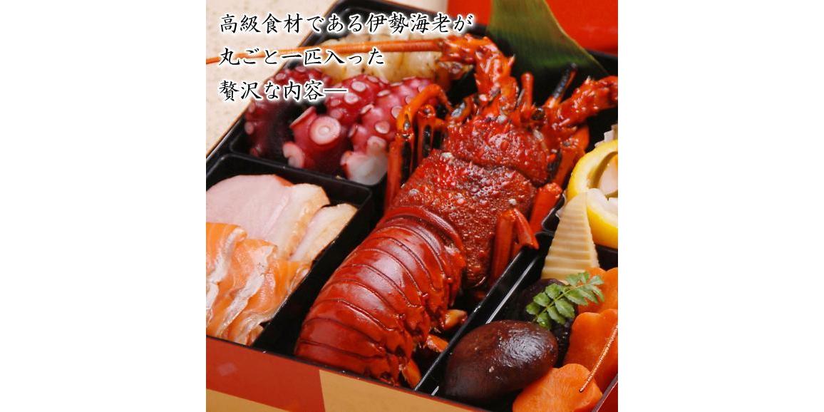 鮮度抜群の国産伊勢海老が丸ごと1匹入った贅沢な海鮮おせちに、南紀勝浦港で水揚げされた上質な生マグロがついてくる、贅沢な二段重3人前の海鮮生おせちです。
