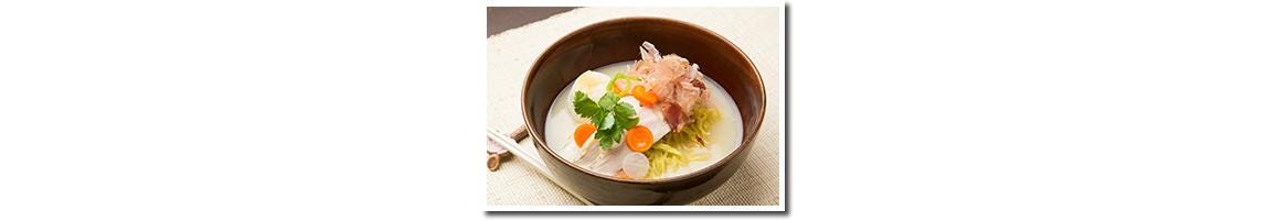 2)①のだしを沸騰しない程度に温めかつお節1つかみ入れて5分おく。煮干しとかつお節を取り出し醬油、塩、酒、みりん、焼かない餅を加えて火を通す。